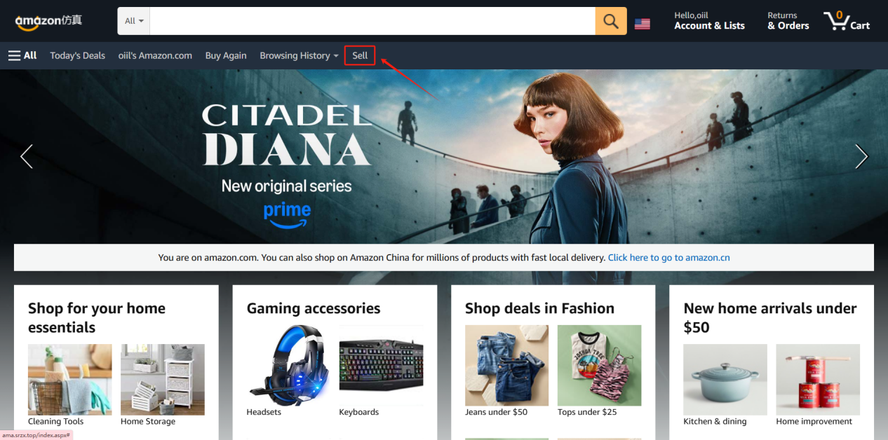 2.进入亚马逊仿真平台首页后,点击“Sell”进入亚马逊商户账户注册页面,如图2所示。