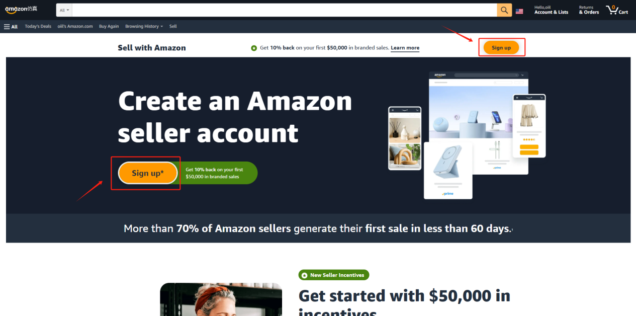 3.进入“Sell with Amazon”页面后,点击“Sign up”进入卖家账号登录页面,如图3所示。