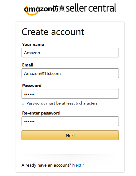 5.进入卖家账户注册页面后,填写姓名、Email、密码等信息,填写完成后,点击“Next”,如图5所示。