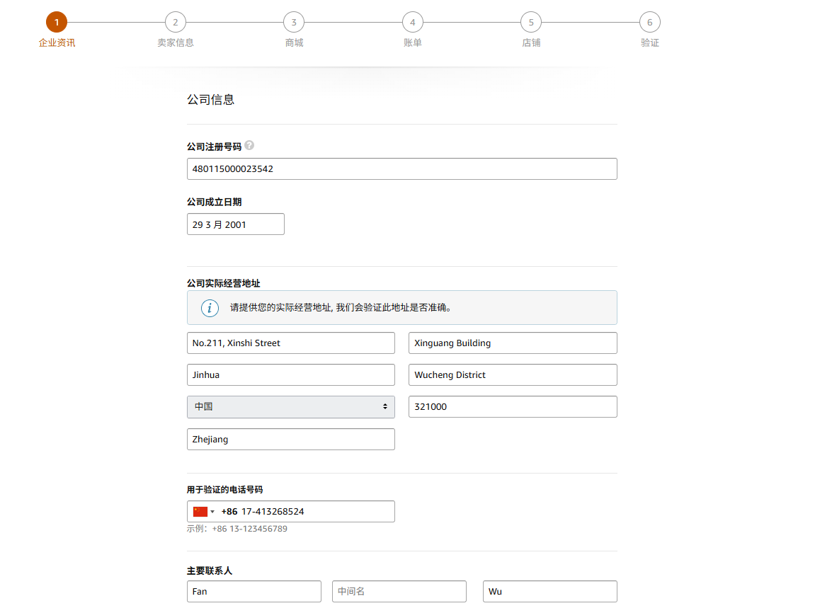 8.按照要求填写企业资讯、卖家信息、商城、账单、店铺,最后验证这6个步骤,依次填写完善,最后点击提交,如图8所示。