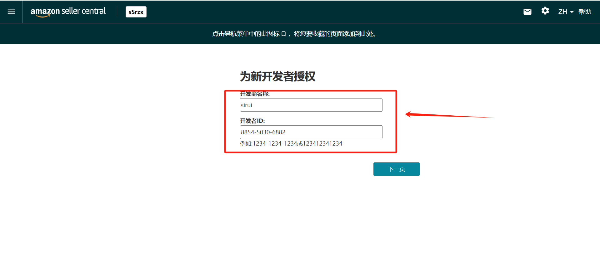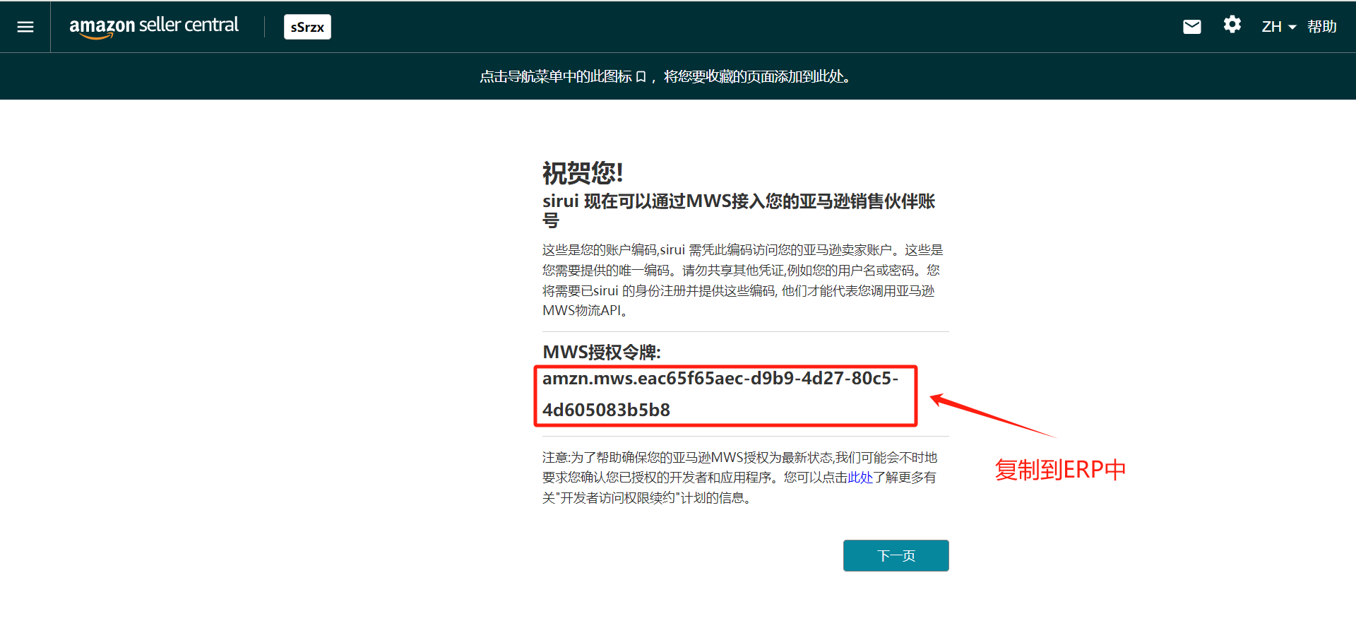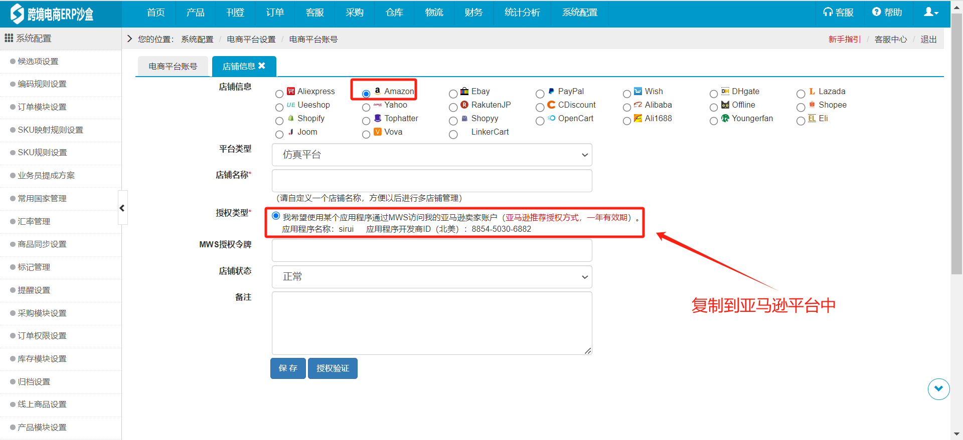15.在ERP沙盒“系统配置-电商平台账号-绑定店铺”信息页面,选择亚马逊仿真平台,并复制应用程序名称和应用程序开发ID到亚马逊为新开发者授权中,如图16和图17所示。之后点击“下一步”并获得MWS授权令牌信息,如图18所示,复制MWS授权令牌信息,如图19所示。
