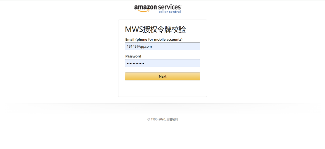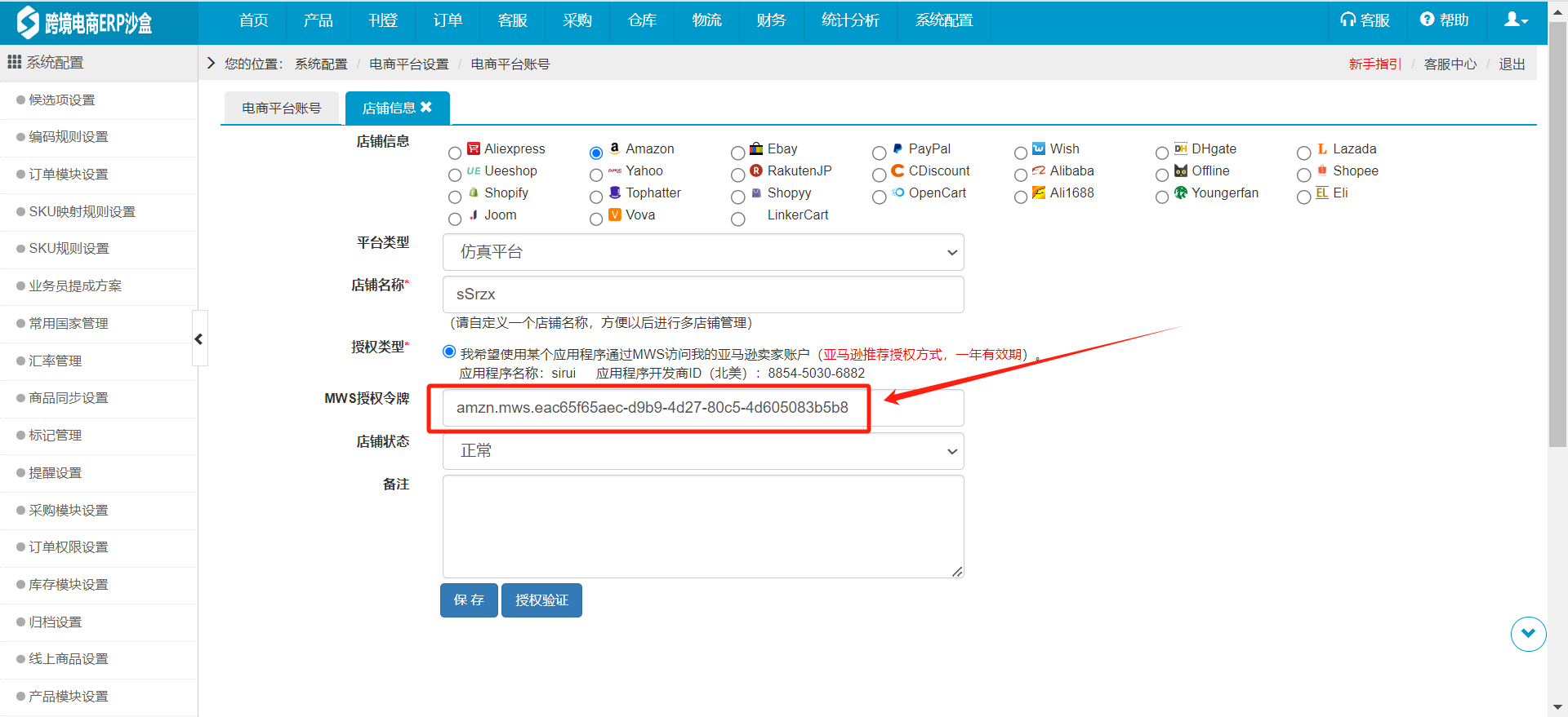 16.返回到ERP沙盒“系统配置-电商平台账号-绑定店铺”信息页面,将MWS授权令牌信息粘贴至对应的位置并保存,如图20所示,之后点击“授权认证”,再次输入自己的亚马逊账号完成授权认证,如图21所示。