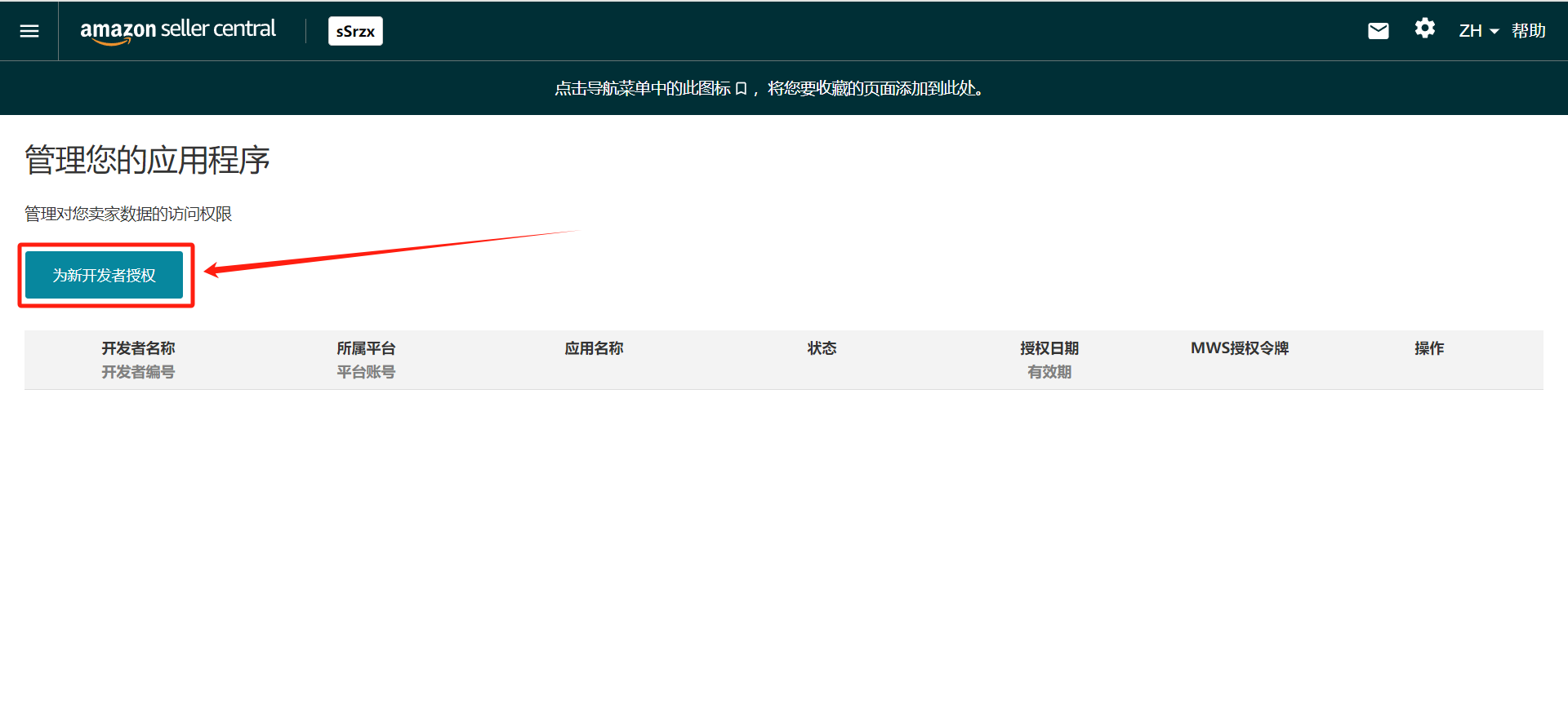 14.在管理您的应用程序页面中,点击“为新开发者授权”进入到授权信息编辑页面,如图14和图15所示。