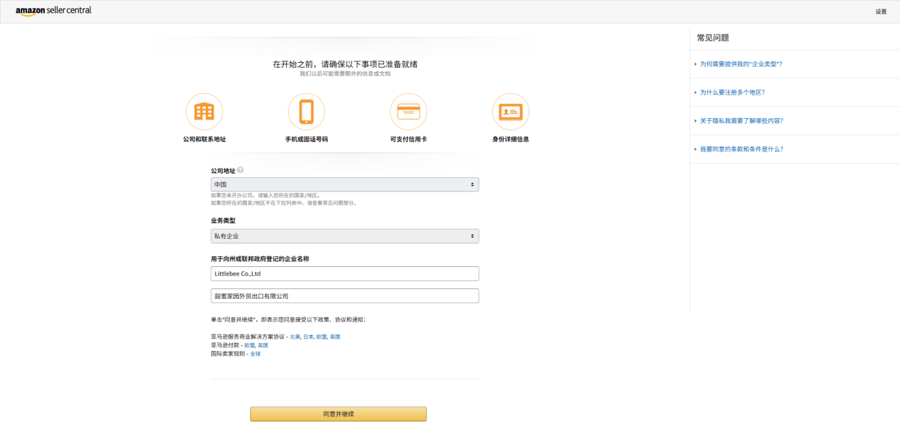 7.选择公司地址及业务类型,填写企业中英文名称,填写完成后点击“同意并继续”,如图7所示。