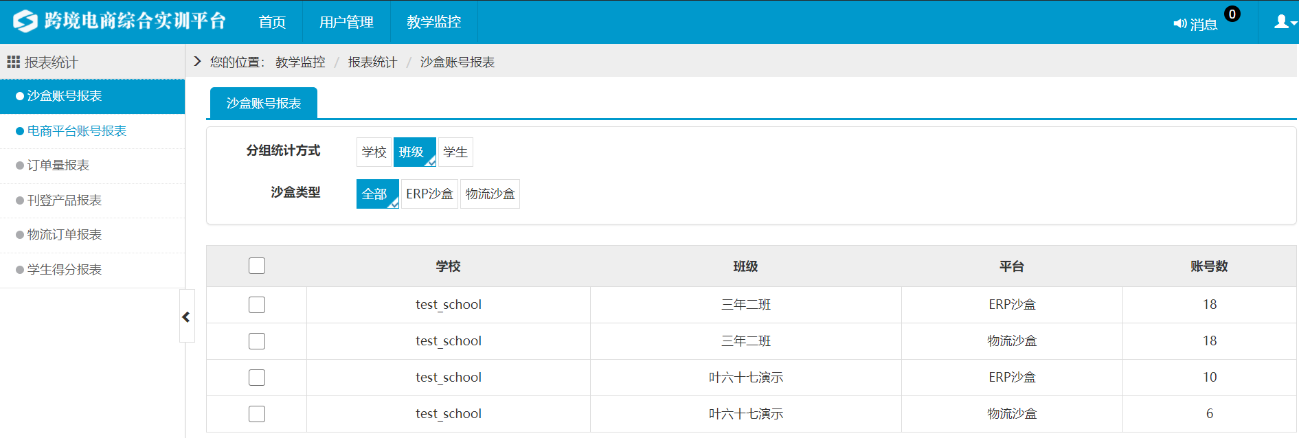 学校管理员可在此页面查看本校的ERP沙盒账号,每个平台的账号数。如图2.1