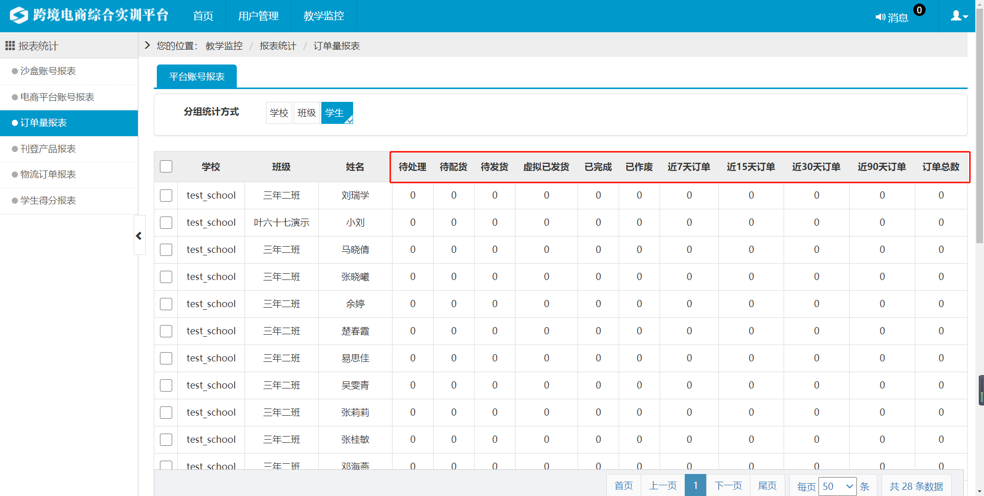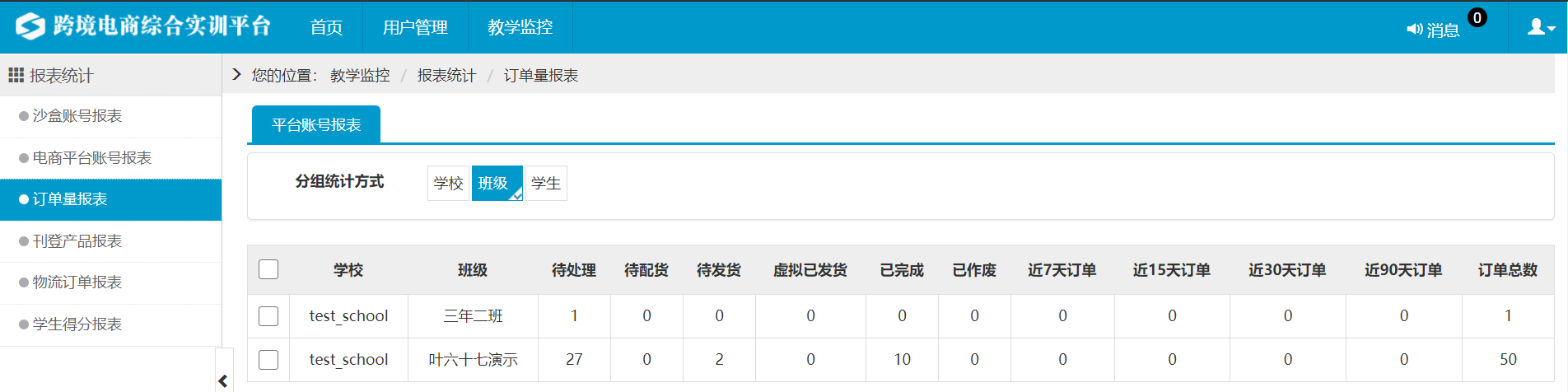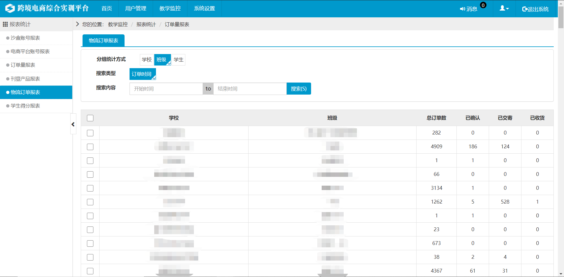 学校管理员可在此页面实时监控本校对物流沙盒订单的处理过程,以及订单所处的状态。如图4.1
